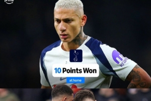 据媒体统计,热刺本赛季主场仅拿到10分,在英格兰前四级别联赛的92支球队中,只有谢周三本赛季的主场积分(9分)少于热刺。