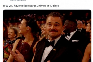 这意味着马竞将在10天内3次对阵巴萨,马竞官方社媒晒出莱昂纳多·迪卡普里奥在奥斯卡颁奖典礼上一脸无奈的照片,配文:“当你不得不在10天内3次对阵巴萨时的感受。”