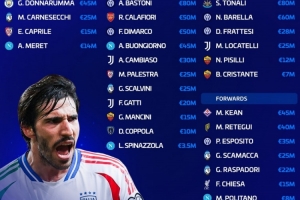 后卫:巴斯托尼(8000万欧)、卡拉菲奥里(5000万欧)、迪马尔科(5000万欧)、布翁乔尔诺(4500万欧)、坎比亚索(3000万欧)、斯卡尔维尼(2500万欧)、帕莱斯特拉(2500万欧)、加蒂(2000万欧)、曼奇尼(1500万欧)、迭戈·库博拉(1000万欧)、斯皮纳佐拉(350万欧)