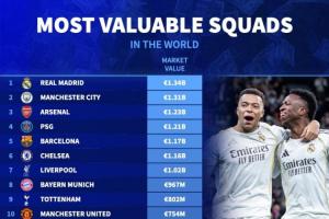 全球身价前20球队:皇马13.4亿居首,曼城枪手分列二三,英超12队
