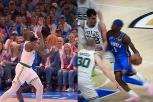 比赛中,SGA在一次合球挂手臂造成犯规后,杰伦·布朗当即对裁判表示:“这不是篮球。”